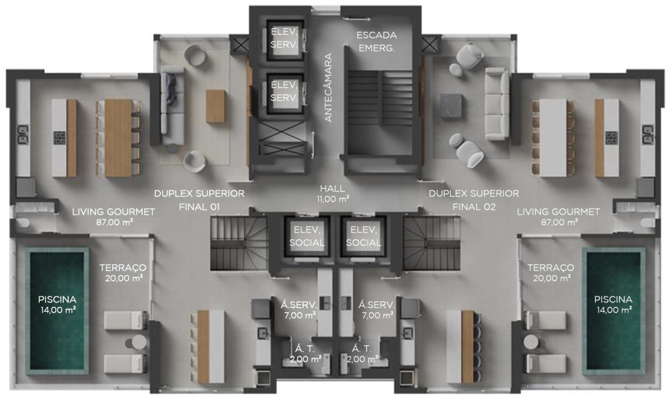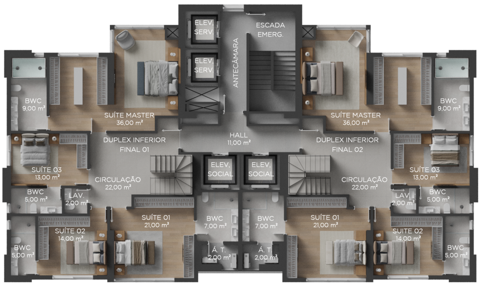 A decoração, paisagismo e revestimentos são meramente ilustrativos. | Os materiais a serem utilizados na construção estão especificados no memorial descritivo. | Esta é uma planta provisória sujeita a alteração sem aviso prévio. | O projeto poderá sofrer modificações decorrentes das posturas municipais, concessionárias e do local. | A planta apresenta localização preliminar de pilares e prumadas de instalações. | As áreas descritas são referentes às áreas privativas de cada unidade. As áreas privativas representam as áreas dos ambientes somadas as suas áreas de paredes. | As cotas são de eixo das paredes e foram definidas pelos limites externos das paredes (fachadas e áreas comuns) e pelo eixo das paredes entre unidades, conforme descrito na NBR 12.721 ABNT. As áreas e cotas poderão sofrer alteração de 5%. | Os móveis, assim como os materiais de acabamento representados na planta são de dimensões comerciais e não fazem parte do contrato de construção. | Memorial de incorporação imobiliária registado na Matrícula n. R-5-138-544 do 1º Ofício de Registro de Imóveis de Balneário Camboriú (SC).